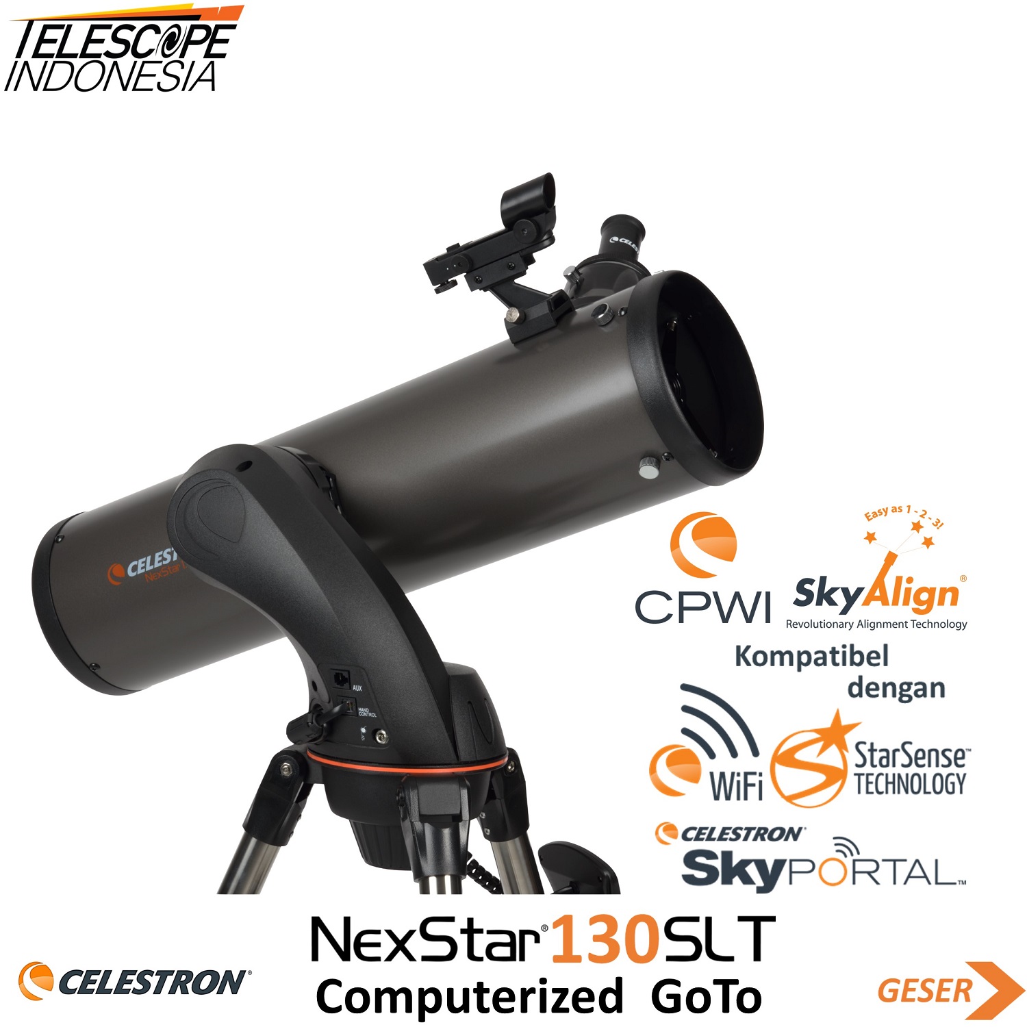 Dan teleskop seri 130SLT, seperti model lain dalam Seri SLT, dilengkapi dengan kontrol tangan yang sepenuhnya terkomputerisasi. Kontrol tangan yang terkomputerisasi memberi Anda kemampuan untuk secara otomatis mengarahkan ke salah satu dari 4.000 lebih daftar objeknya, termasuk lebih dari 600 galaksi, 300 gugus bintang, dan puluhan bintang ganda yang indah. Dengan tripod baja siap rakit yang dapat disetel, NexStar 130SLT dapat siap digunakan dalam hitungan menit. Teknologi penyelarasan SkyAlign kami yang baru dan Finderscope StarPointer yang disertakan dengan LED merah, membuat proses penyelarasan menjadi mudah.